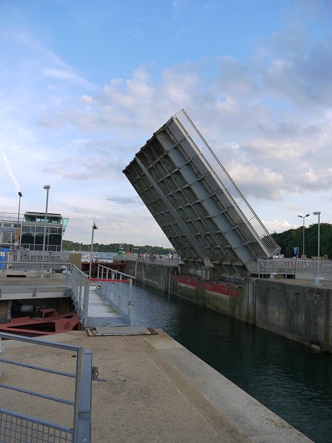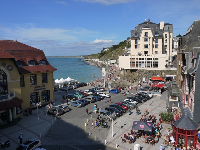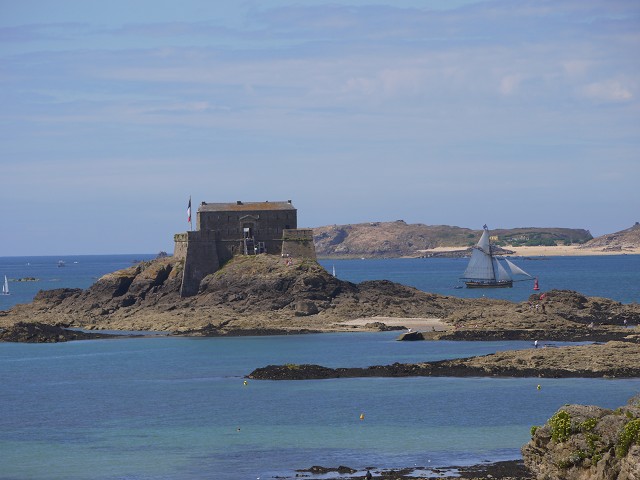 Etwa halb 9 standen wir auf und brachen dann auf zum Haupthaus unseres Hotels "Auberge Saint Pierre", um zu frühstücken. Das Frühstücksbuffet war sehr reichhaltig, von süßen Teilchen über Baguette und Crepes, Joghurts und Apfelmus, Früchte sowie Ei mit Speck, Cornflakes usw. Dann wollten wir eigentlich noch ein wenig durch das Watt stiefeln, aber so richtig einladend sah dieses nicht aus. Zum einen nieselte es schon wieder und zum anderen war der Strand heute wegen Bauarbeiten offiziell gesperrt, auch wenn man sicher hingekommen wäre. Wir ließen es dann aber doch bleiben und fuhren mit dem Shuttlebus zurück zum Festland. Die Busse sind übrigens sehr spannend, da sie jeweils ein Führerhaus vorne und hinten haben und somit nicht wenden brauchen. Am Parkplatz kauften wir noch ein paar Kleinigkeiten im Supermarkt und fuhren dann in Richtung St. Malo. An der Moulin de Moidrey machten wir einen kurzen Zwischenstopp und fuhren dann weiter zum Gezeitenkraftwerk von Rance. Richtig besichtigen konnte man es nicht, aber wir lasen wenigstens die Infotafeln. Der Tidenhub beträgt an dieser Stelle 13,5 Meter! Daher ist der Platz ideal für ein solches Kraftwerk. Nun wollten wir die Stadt St. Malo besichtigen. Da es keine Parkplätze in der Altstadt gibt, parkten wir außerhalb und namen einen Shuttlebus zur City. Dort angekommen, wollte wir uns als erstes nach der Fähre nach Jersey erkundigen. Allerdings hätten wir am nächsten Morgen bereits um 7.15 Uhr am Terminal sein müssen. Der Parkplatz davor war nicht für Wohnmobile geeignet bzw. man wäre auf die Gnade der Security angewiesen. Wir verwarfen also den Plan und gingen nun in die Altstadt von St. Malo. Die Stadt ist komplett von einer Ringmauer umgeben, auf der wir ein Stück entlang wandelten. Von der Westseite sieht man bereits das Cap Frehel. Hier ist auch ein schöner Strand gelegen. In der Stadt aßen wir einen Galette und gingen dann zum Shuttle zurück. Die Brücke über den Hafen wurde jedoch gerade hochgezogen und einige Segelboote und ein größeres Transport-Schiff passierten die enge Wasserstraße. Dann konnten wir nach etwa 10 Minuten auf die andere Seite. Mit dem Wohnmobil fuhren wir nun noch einmal zurück nach Dol-de-Bretagne, denn wir hatten auf dem Hinweg vergessen, den größten Menhir der Bretagne zu besichtigen. Dies wollten wir noch nachholen. Gegen 18 Uhr kamen wir am Menhir de Champ-Dolent an, der am Rande eines Maisfeldes steht. Wir machten ein paar Fotos von dem 9,50 Meter hohen Riesen und fuhren dann zur Küste zurück, dem Cap Frehel entgegen. Da wir schon recht spät dran waren, waren bereits alle Campingplätze verschlossen, aber in Saint-Cast-le Guildo fanden wir doch noch ein lauschiges Plätzchen oberhalb eines Strandes. Wir rangierten eine Weile hin und her bis wir endlich einigermaßen gerade standen auf dem abschüssigen Platz und bereiteten uns dann einen "Strammen Max" zum Abendbrot.