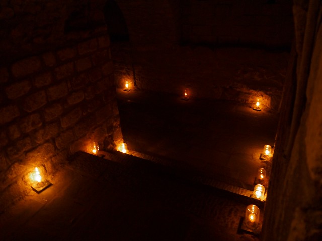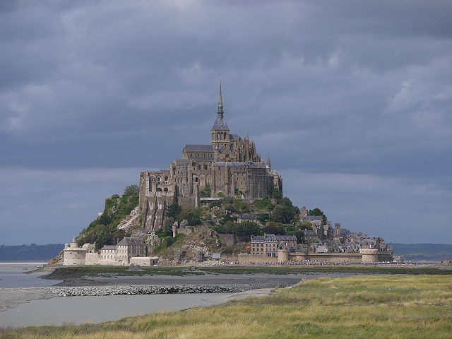 Heute schliefen wir einmal etwas länger bis 8.30 Uhr und wollten dann duschen gehen. Die Duschen sahen sauber und ordentlich aus und wir drehten munter das warme Wasser auf, aber es kam nur kaltes und blieb auch kalt. *Grml* Wie wir erst später sahen, muss man Wertmünzen an der Rezeption kaufen, um auch warmes Wasser zu bekommen. Jana wusch sich dann die Haare am Waschbecken, wo es auch so zumindest lauwarmes Wasser gab. Sascha duschte ganz kalt. Gut erfrischt frühstückten wir noch und fuhren dann die Küstenstraße nach Genêts, von wo wir den ersten Blick auf den Mont St. Michel erhaschten. Danach fuhren wir nach Avranche, da wir für Sascha noch eine Jacke kaufen wollten. Er hatte seine nämlich in München vergessen. In einem Gewerbegebiet fanden wir einen Decathlon und erstanden günstig eine Jacke. Danach fuhren wir zum Mont St. Michel, wo wir für heute Abend eine Übernachtung im Hotel gebucht hatten. Laut Buchungsbestätigung sollten wir unser Auto auf dem Parkplatz 3 abstellen, der für Hotelgäste reserviert ist. Als wir dort ankamen, schickte uns der Anweiser jedoch einfach weiter, weil er unser Wohnmobil wohl nicht auf den Parkplatz lassen wollte. Wir fragten also am nächsten und die schickten uns wieder zu Parkplatz 3. Na toll. Wir riefen das Hotel an und ließen uns schon einmal den Code für Parkplatz 3 geben und wagten dann den nächsten Versuch. Diesmal stand gar kein Einweiser davor und so gaben wir den Code ein und fuhren einfach auf den Parkplatz. Dann packten wir unsere paar Sachen für die eine Nacht und stiefelten über den Damm bis zum Klosterberg. Man braucht ganze 40 Minuten bis dort hin, obwohl er schon vom Festland zum Greifen nahe aussieht. Dann checkten wir im Hotel ein und eine nette Lady vom Hotel begleitete uns durch das Gassen-Gewirr zu unserem Hotelzimmer, welches in einem anderen Gebäude im Dorf lag. Dorthin gelangten wir über die wohl schmalste Gasse Frankreichs, die gerade einmal schulterbreit war. Das Zimmer ist urisch gemütlich, einerseits mit alten Möbeln versehen und andererseits top modern renoviert mit einem modernen Bad. Im Hotel gaben sie uns noch den Tipp, am Abend nach 19 Uhr zur Abbaye aufzusteigen, da dann dort Musik und spezielle Beleuchtung sein würde. Wir bummelten also noch ein wenig durch die Gassen des Dorfes und suchten uns dann ein Restaurant. Dort aßen wir Lamm mit Speckbohnen und Ratatouille. Als Vorspeise hatte Sascha Schinken und Salat und Jana eine Fischsuppe (die war nicht lecker). Dafür war das Dessert umso besser. Wir hatten Creme Brulee und einen Crepe mit Schokosauce. Hmmm! Dann stiegen wir die zahlreichen Treppenstufen zur Abbaye auf und wanderten dann durch die nächtlichen Gemäuer. Alles war toll illuminiert, teils mit Kerzen, teils mit bunten Strahlern. In einigen Räumen wurde musiziert, so z.B. mit einer Harfe, Geige und Flöte. Zunächst sahen wir die älteren Kapellen, die heute nur noch das Fundament für die große obere Kathedrale bilden. Diese ist unglaublich beeindruckend - zumal im spärlichen Licht bei Nacht. Von dort kommt man auch auf die Westterrasse. Von hier kann man die gesamte Bucht überblicken und die Lichter auf dem Festland betrachten. Der Wind pfeift einem hier oben mächtig um die Ohren. Etwas ruhiger ist es dann schon im Kreuzgang. Kurz vor Mitternacht fielen wir dann schließlich in unsere Betten - noch ganz beeindruckt von dem nächtlichen Rundgang über den Klosterberg.