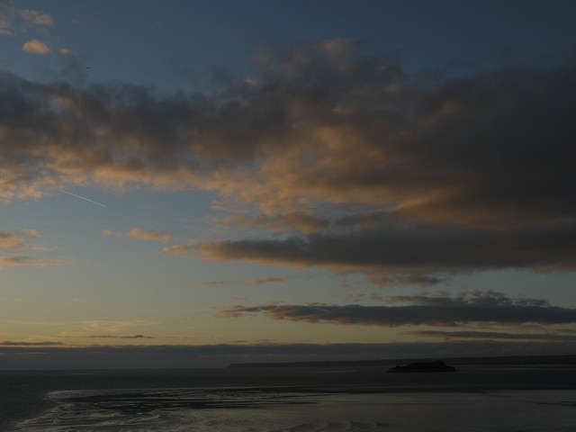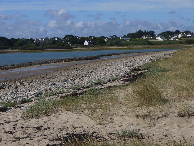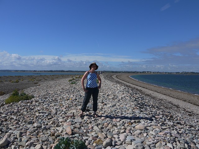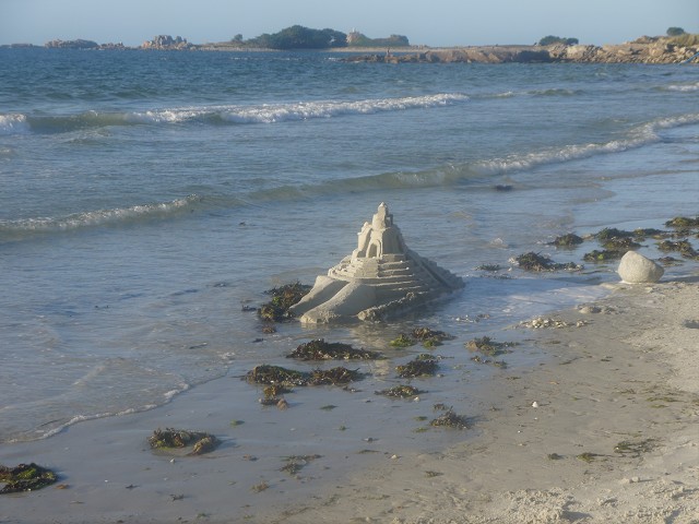 Als wir um 7.30 Uhr die Augen aufschlugen, regnete es wieder einmal. Also drehten wir uns noch einmal um und schliefen noch etwas. Um 9 Uhr standen wir dann auf und frühstückten. Als wir dann kurz vor 10 Uhr den Platz verlassen wollten, stellten wir fest, dass wir unser Stromkabel nicht selbst entfernen können, da es hinter einem Kasten eingeschlossen war. Sascha ging also zur Rezeption. Dennoch dauerte es noch etwas bis schließlich ein Platzwart kam und uns erlöste. Jana wurde schon ganz hibbelig, denn wir wollten zum Sillon de Talbert und bekanntlich sind die Parkplätze knapp je später man kommt. Schließlich klappte aber doch alles reibungslos und wir fanden einen Parkplatz etwas abseits im Ort. Dann stiefelten wir auf die 3 km lange Landzunge. Es war gerade Flut und so war die Kontur gut zu erkennen. Anfang gingen wir noch barfuß durch den weichen, warmen Sand. Aber nach etwa einem Drittel ging es über Kies und große flache Kieselsteine. Der Weg war dadurch teilweise recht beschwerlich und es dauerte somit auch eine ganze Weile bis wir das Ende erreichten. Insgesamt verbrachten wir etwa 2,5 Stunden auf dem Sillon de Talbert. Wieder zurück kehrten wir in dem kleinen Restaurant am Beginn der Landzunge ein. Wir bestellten jeder eine Backkartoffel - Sascha nach Bretonischer Art (Patate Bretonne) mit Speck, Zwiebeln und Pilzen und Jana mit Meerenfrüchten (Patate Oceane), also mit Miesmuscheln, Grevetten und einem Filet der Dorade. Das Restaurant war auch sehr hübsch eingerichtet mit Sitzbänken in Form eines Ruderbotes und anderer maritimer Einrichtung. Weiter ging es dann für uns zum Gouffre bei Plougescrant. Hier steht auch das berühmte Haus zwischen den Felsen. Wir fotografierten wie die Weltmeister. Der Gouffre selbst war weniger spektakulär, da das Meer recht ruhig war und die Brandung somit weniger intensiv in die Felsspalte zischte. Wir machten noch einen Spaziergang auf der Halbinsel und als wir nach etwa 1 Stunde wieder am Haus und dem Gouffre waren, war die Flut auf ihrem Höhepunkt die zahlreiche Felsen nun unter Wasser. Nun war es bereits gegen 19 Uhr und so tuckerten wir langsam mit unserem Wohnmobil die Halbinsel wieder hinab in Richtung der rosa Granitküste. In Port Blanc fanden wir noch einen Campingplatz, der direkt am Meer gelegen ist. Wir schlenderten noch einmal an den Strand. Hier hatte eine Familie eine tolle Sandburg gebaut, die echt kunstvoll mit Treppen, Auffahrten usw. ausgestattet war. Allerdings dauerte es keine 5 Minuten bis die immer höher steigende Flut das Kunstwerk völlig zerstört hatte. Die Kinder standen recht fassungslos davor und taten uns schon leid. Zurück am Camper kochten wir unser Abendbrot - Geschnetzeltes mit Champignons und Ebly. Hmmm!