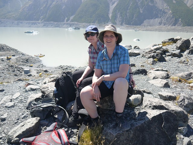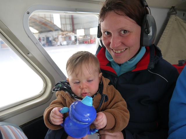Im Gegensatz zur vorherigen Nacht froren wir diesmal nicht so sehr. Möglicherweise haben wir uns bereits angepasst. Nach dem Duschen im Beisein vieler verschiedener Insekten bereiteten wir unser Frühstück vor. Zum ersten und einzigen Male nutzten wir das Sonnenverdeck des großen Campers. Dadurch konnten wir verhindern, dass uns die einfallende Morgensonne blendete. Wir beschlossen, an diesem Tag zwei Wanderungen im Mount Cook Nationalpark zu machen. Deshalb verlängerten wir unseren Aufenthalt auf dem Glentanner Campingplatz um eine Nacht, bevor wir kurz vor elf mit einem Camper abfuhren. Die Großeltern beschäftigten Anika während der Fahrt, oder war es umgekehrt? Auf einer frisch geteerten Privatstraße erreichten wir den Blue Lakes Parkplatz und bereiteten uns auf unsere erste Wanderung vor. Anika wurde in den Buggy gesetzt uns los ging es. Zumindest, bis wir merkten, dass der Weg aus grobem Kies bestand. Es half nichts. Anika wurde dann von Angelika und Sascha im Buggy getragen und genoss die Sonderbehandlung sichtlich. Prinzessin Mimi! Von einer Anhöhe konnten wir einen Teil des Tasman Lakes überblicken. Wir sahen Eisberge, die auf dem See schwammen. Während zwei von uns bis zum Ufer des Sees herunterstiegen, blieb der Rest auf der Anhöhe. Wir beobachteten, wie eine Gruppe von Chinesen auf Schlauchboote verladen wurden und zu den Eisbergen fuhren. Wie winzig die Boote gegen die Eisberge aussahen! Erst jetzt wurden die Dimensionen klar. Auf dem Rückweg bekam Anika Hunger, jedoch war unter der brütenden Sonne an Füttern nicht zu denken. Wir wussten, dass am Parkplatz eine Hütte war, also wurde Anika schnellstmöglich und unter großem Geschrei wieder von Angelika und Sascha dorthin getragen. Mit ihrer Mahlzeit wurde sie auch wieder ruhiger. Anschließend fuhren wir zum Mount Cook Village und besuchten die Besucherinformation. Sehr geschickt war diese genau auf den Mount Cook ausgerichtet, den man durch ein großes Panoramafenster bewundern konnte. Dazu gab es Ausstellungen, die sich um Themen des Nationalparks drehten, wie zum Beispiel die Besteigungen des Mount Cook oder eingeschleppte Tierarten. Nachdem wir auch ein paar Souvenirs gekauft hatten, zogen wir weiter in das nächstliegende Café, da wir alle etwas Hunger bekommen hatten. Wie sich zeigte, war "The Old Mountaineer" ein Lokal, das um seine Existenz erst streiten musste. Die Besitzer hatten vor nicht allzu langer Zeit einen Rechtsstreit gewonnen, der sie im Ort als Wettbewerber neben dem einzigen anderen Versorger, dem Hermitage Hotel, zuließ. Dieses besuchten wir auch kurz, um es mal gesehen zu haben. Es zog uns zu unserer zweiten Wanderung auf dem Hooker Valley Track. Diesmal hatten wir gelernt und nahmen Anika in einer Trage mit, in der sie auch nach kurzer Zeit schon eingeschlafen war. So schafften wir es, über zwei schön schaukelnde Hängebrücken zu gehen und grandiose Sichten auf Gletscherseen und Berge zu genießen. Insbesondere der finale Blick auf den Mount Cook hatte es uns angetan. Hier rasteten wir eine Weile, bevor es dann langsam zurück ging. Vor der Rückfahrt durfte Anika sich noch die Füße im Gras vertreten, im dem sie fast völlig versank, und dann fuhren wir auch schon zurück zum Glentanner Park Centre. Nach dem Abendessen brauchten wir sehr lange, um selbst ins Bett gehen zu können, da Anika bis Mitternacht nicht schlafen wollte und sich durch Weinen davor wehrte.