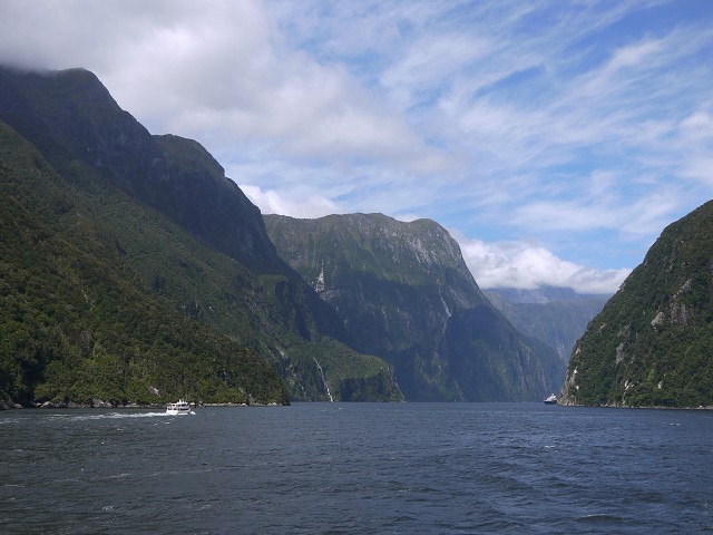 In Erwartung unseres Fluges zum Milford Sound standen wir bereits 6:30 Uhr auf und wurden mit Dauerregen belohnt. Wir frühstückten in der Küche statt wie bisher zwischen den Campern im Freien. Noch immer in froher Erwartung parkten wir die Camper um, kauften ein gutes Brot für den Abend und riefen die Hotline der Agentur an, nur um zu erfahren, dass der Flug nicht stattfinden wird. Eigentlich wollten wir direkt nach dem Flug weiter nach Norden fahren. Nun forderten wir ein letztes Mal unser Glück heraus und buchten sehr zerknirscht auf 14 Uhr um. Dies machte es nötig, eine weitere Nacht in Queenstown zu bleiben. Unsere Plätze auf dem Top 10 Creeksyde Campingplatz standen für eine weitere Nacht zur Verfügung, also schlugen wir kurz entschlossen zu. Nun mussten wir für wenige Stunden bis zum Nachmittag in Queenstown die Zeit überbrücken. Dies fiel uns erstaunlich schwer, denn die kleine Innenstadt hatten wir bereits zur Genüge in den Tagen zuvor gesehen. Wir spazierten zu den Queenstown Gardens, den wir bisher links liegen gelassen hatten. Dort nutzte Sascha ein Seil, um sich über einen Bach ganz nach Tarzans Art zu schwingen. Für das Foto musste die kraftraubende Aktion leider mehrfach wiederholt werden. Dann bewunderten wir die überaus dicken Bäume, saßen verträumt in der Sonne und beobachteten die kleinen Entchen auf einem Teich. Wir schauten zwei Männern beim Boule zu und genossen den Blick über den Lake Wakatipu. Wir tranken noch ein Heißgetränk, und dann wussten wir nicht mehr, was wir tun könnten. Zu unserem Glück wurde unser Flug zum Milford Sound im richtigen Moment zugesagt. Um 13:30 Uhr wurden wir mit dem Taxi vom Campingplatz abgeholt und zum Flughafen gefahren. Hier empfing uns unser gut gelaunter Pilot, der mit allerlei Sprüchen für Heiterkeit sorgte. Schnell ließen wir in der kleinen Maschine Queenstown hinter uns und flogen über die Berge und verschiedene Drehorte vom Herrn der Ringe. Die Bergwelt mit ihren schroffen Felsen, kleinen Seen und tiefen Schluchten war unglaublich faszinierend. Wir konnten uns nicht satt sehen, bis sich dann der Milford Sound vor uns auftat. Wir überflogen den gesamten Fjord, da das Flugzeug Platz für den Sinkflug brauchte. Nach einer großen Kurve landeten wir schließlich auf dem abgelegenen Flughafen. Mit einem Shuttlebus wurden wir zum nicht weit entfernten Hafen gefahren, wo wir ohne weitere Pause direkt unser Schiff betraten. Alles war komplett durchorganisiert für die effiziente Abfertigung einer großen Zahl an Touristen. Auf dem Boot organisierte Jana uns fünf Verpflegungsboxen, an denen wir uns etwas stärkten. Währenddessen war das Schiff bereits losgefahren. Wir gingen abwechselnd auf das Oberdeck, da immer einer mit Anika unter Deck blieb, und bestaunten die hoch aufragenden Berge, die sich direkt aus dem Fjord erhoben. Ein dichter Teppich aus Bäumen bedeckte sie. Laut Ansage im Boot kommt es nicht selten zu sogenannten Baumlawinen, wenn ein Baum den Halt am Hang verliert und hunderte anderer Bäume mit sich in die Tiefe reißt. Aufgrund des vielen Regens der vergangenen Tage hatten sich zahlreiche Wasserfälle gebildet, die zwischen den Bäumen in die Tiefe stürzten. Von einem Felsüberhang in unermesslicher Höhe zerstob ein Wasserfall im Wind. Andere Wasserfälle, die selbst über hundert Meter hoch waren, wirkten geradezu winzig im Vergleich zu den Bergen, von denen sie sich ergossen. Auch die anderen Boote wirkten wie Ameisen in dem riesigen Fjord. Als Besucher erhielt man ein Gefühl von Bedeutungslosigkeit inmitten dieser großartigen Natur. Wir fuhren bis zum Ende des Fjords, wo er ins offene Meer überging und erfuhren, dass er erst sehr spät als Fjord erkannt wurde. Kapitän Cook hielt ihn noch für eine Bucht, da die Einfahrt des Fjords etwas um die Ecke geht. Auf der Rückfahrt steuerte unser Kapitän das Boot direkt in einen Wasserfall. Der starke Wind nahm uns fast den Atem, und die Wasserspritzer waren eine willkommene Erfrischung bei dem herrlich sonnigen Wetter. Auch wenn der Wasserfall tatsächlich so hoch wie ein Hochhaus war, wirkte er auf uns weniger hoch, da die Berge um ihn herum deutlich höher aufstiegen. Anika genoss die Fahrt auf ihre Weise. Sie untersuchte ausgiebig die Schrauben des Tisches, auf dem sie herumrobbte. Sie trank aus einem unserer Trinkpäckchen süßen Saft. Und sie machte zur Freude aller in ihre Windeln. Als wir zurück an der Anlegestelle waren, merkten wir erst den Sonnenbrand in unseren Gesichtern. Sascha hatte es besonders stark erwischt. Unser Rückflug nach Queenstown war noch schöner als der Hinflug. Wir hatten den Eindruck, dass er länger war. Vor allem kamen wir den Sutherland Falls, den höchsten und beeindruckendsten Wasserfällen Neuseelands, ganz nah. Außerdem flogen wir durch die Wolken, über Gletscherseen und die faszinierende Bergwelt. Am Ende überflogen wir den Lake Wakatipu und landeten wieder in Queenstown. Wir waren begeistert von diesem Ausflug und bedauerten es in keiner Weise, so lange darauf hatten warten zu müssen. Unser Abendessen mit Rührei und leckerem Brot schmeckte uns so noch um einiges besser. Am Abend begann es dann wieder zu regnen, was uns aber wenig störte. Wir entspannten in der Küche, bevor wir ermattet zu Bett gingen.