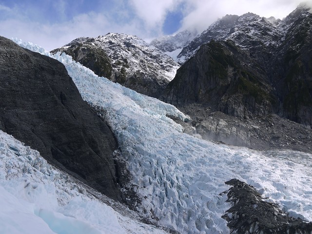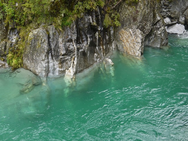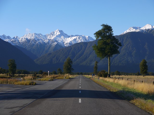 Ein neuer frischer, sonniger Morgen erwartete uns. Wir fuhren vom Top10 Holiday Park an die Strandpromenade von Wanaka, wo wir unsere Camper parkten. Jana ging mit ihren Eltern im Supermarkt einkaufen, während der Rest zurückblieb und entspannte. Im Anschluss beschlossen wir, jeder auf eigene Faust die Innenstadt zu erkunden. Die 3 Großeltern fanden für Anika ein Paar süße Hausschuhe, damit sie nicht an den Füßen friert. Nachdem wir noch eine Kleinigkeit gegessen hatten, ließen wir Wanaka hinter uns. Unsere Fahrt ging zuerst entlang des Lake Hawea und nach einer Biegung der Straße plötzlich entlang des Lake Wanaka. Kurz dahinter hielten wir am Straßenrand an, um durch den Regenwald zu den Blue Pools zu wandern. Es hatte inzwischen mal wieder zu regnen begonnen, jedoch war die Wanderung nicht allzu lang. Die Pools waren tiefere Stellen eines Flusses, der eine schöne türkisblaue Farbe aufwies. Mehr noch als das Wasser gefielen uns die Hängebrücken auf dem Weg, die herrlich schaukelten. Von nun an wurde das Tal, durch das wir fuhren, immer enger und tiefer. Die Straße wurde immer kurviger, gleichzeitig wurde die Sicht aufgrund des Regens immer schlechter. Der Haast Pass, den wir durchfuhren, zeigte sich nicht von seiner besten Seite. Mitten im Gebirge überquerten wir eine Einbahnbrücke, die Gates of Haast Bridge. Hier machten wir eine kurze Pause, um die tosenden, weißschäumenden Wassermassen auf ihrem Weg durch die Schlucht zu betrachten. Nach der Brücke wurde das Tal wieder breiter und immer flacher. Die Berge zogen sich immer mehr zurück. In Haast, an der Tasmanischen See, war das Land flach und weit. Hier tankten wir noch einmal, bevor wir die mit über 700 Metern längste einspurige Straße Neuseelands befuhren. Keine der drei Stellen zum Ausweichen von entgegenkommendem Verkehr mussten wir benutzen. Danach befanden wir uns wieder im Regenwald auf einer Straße, die der Küstenlinie mit sehr vielen Kurven folgte. Ein lautes Klatschen verkündete uns, dass wir mit dem großen Camper einen Vogel mitgenommen hatten. Nachdem er unsere Frontscheibe touchiert hatte, war er genauso schnell wieder aus dem Blickfeld verschwunden, wie er aufgetaucht war. Sein weiteres Schicksal ist uns daher leider unbekannt. Am Lake Paringa wechselten wir die Fahrer aus für die restliche, nun nicht mehr allzu lange Strecke bis nach Fox Glacier. Dort fuhren wir direkt auf den Top10 Holiday Park und kochten uns in der Küche Nudeln mit Tomatensoße. Seit dem Haast-Pass hatte es nicht aufgehört zu regnen, es war kalt und unangenehm. Laut Wetterbericht sollte der nächste Morgen allerdings frisch, windstill und klar werden. Wir saßen zusammen in der Küche und blickten mit misstrauischen Augen in den Regen, bevor wir uns schlafen legten.