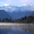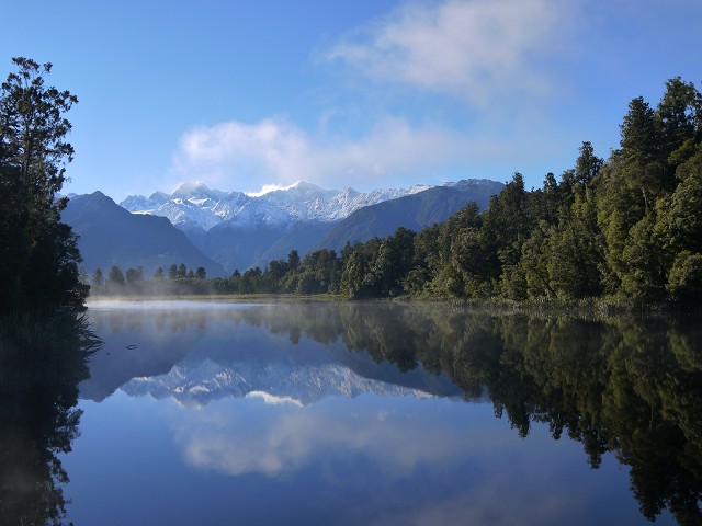 In Erwartung des vorausgesagten guten Wetters standen wir schon um 7 Uhr auf, so dass wir ohne Frühstück um 8 Uhr den Campingplatz verließen. Der Wetterbericht hatte nicht zuviel versprochen, sämtliche Wettergötter waren uns hold. Die Morgensonne tauchte die Bergspitzen in morgendliches, rötliches Licht. Keine Wolke trübte den blauen Himmel nur etwas Morgennebel waberte über die Felder. Wir waren entzückt. Nur wenige Minuten brauchten wir zum Parkplatz am Lake Matheson. Von hier aus mussten wir noch über eine Hängebrücke und ein gutes Stück am See entlang durch den Regenwald laufen. Unsere Erwartungen trieben uns an. Hinter jeder Ecke vermuteten wir den ersehnten Aussichtspunkt Reflection Island. Endlich erreichten wir den kleinen Holzsteg, der vom Ufer etwas ins Wasser reichte. Anfangs kräuselte leichter Wind noch die Oberfläche des Sees. Dann wurde es windstill. Glatt wie ein Spiegel lag der See nun vor uns. An seinen Rändern stieg feiner Nebel auf. Die Bäume an seinem Ufer spiegelten sich in seinem dunklen Wasser. Majestätisch überragten der Mount Cook sowie Mount Tasman im Hintergrund die Szenerie. Ihre Spiegelbilder im See standen dem in nichts nach. Das Motiv gilt als eines der zehn schönsten in der Welt. Genauso sahen wir es auch. Wir konnten uns nicht satt sehen und schossen Bild um Bild. Dafür hatte sich das frühe Aufstehen gelohnt, ja sogar die Fahrt durch den Regen am vergangenen Tag. Nur langsam konnten wir uns von diesem Bild lösen und wanderten von Eindrücken überwältigt unserem Frühstück entgegen. Das Café am Parkplatz erwies sich als hervorragend. Wir saßen draußen in der frischen Morgenluft mit einem herrlichen Blick auf die schneebedeckten Gipfel um den Mount Cook und genossen den Morgen bei Cappuccinos mit hübscher Verzierung, heißer Schokolade, frischem Orangensaft und Toasts. Es fiel uns dabei nicht schwer, all die anderen Touristen zu ignorieren. Gut gesättigt fuhren wir die Straße noch etwas weiter. Von einem kleinen Parkplatz aus konnte man nun auch noch den Fox Glacier in voller Größe bewundern. Unser Tagesziel war allerdings der Nachbargletscher, der Franz-Josef-Gletscher. Dazu mussten wir noch etwa eine halbe Stunde fahren und erreichten dann den zum Gletscher gehörigen Touristenort gleichen Namens. Auf den ersten Blick fiel uns auf, dass hier nichts weiter war als ein paar Annehmlichkeiten, die man für die Touristen brauchte. Wir stellten unsere Camper auf dem Campingplatz Rain Forest Retreat ab und trennten uns. Sascha und Angelika wollten per Hubschrauber auf den Gletscher fliegen, während die anderen eine Wanderung zum Fuß des Gletschers planten. Die Wanderer konnten es gar nicht fassen, wie weit sich der Gletscher seit ihrer letzten Besichtigung 2008 zurückgezogen hatte. Die Flieger genossen den Hubschrauberflug und die herrliche Sicht von oben. Einmal auf dem Gletscher gelandet, wobei sie einen ehemaligen Kollegen von Sascha und seine Frau trafen, wurden sie von einem lustigen, freundlichen Neuseeländer in einer Gruppe über den Gletscher geführt und mit allerhand Wissen überschüttet. Daneben durften sie durch Eishöhlen klettern, kriechen und rutschen und die Sicht auf die umliegenden Berge, die zum Teil mit Regenwald bedeckt sind, genießen. Diese Konstellation, Gletscher, Meer und Regenwald direkt nebeneinander, findet sich nur dreimal in der Welt. Der lustige Neuseeländer erzählte eine amüsante Anekdote über die schlauen Keas, die Bergpapageien Neuseelands, und die traurige Maori-Geschichte zur Entstehung des Gletschers. Die beiden genossen den Rückflug und kehrten erschöpft von den Eindrücken zum Campingplatz zurück. Nachdem die anderen noch einen kleinen Abendspaziergang machten, gab es Abendbrot und anschließend eine kleine Feier im kleinen Camper. Für die Nacht nahmen Jana und Sascha Anika zu sich in die Mitte, was die Kleine friedlich schlafend genoss.