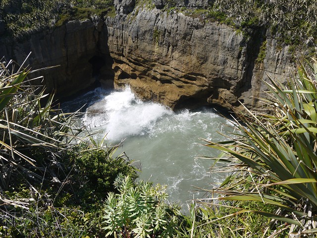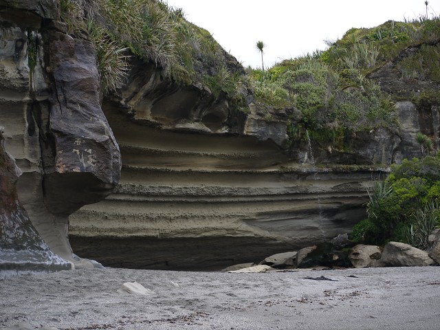Diesmal konnten wir uns erlauben auszuschlafen, denn wir hatten kaum Fahrt vor uns. Wir frühstückten in der Sonne mit Meerblick und genossen den Morgen. Dann fuhren wir die 35 km bis Punakaiki und dort direkt auf den Campingplatz. Vermutlich waren wir die ersten neuen Gäste des Tages, denn der Platz war noch ganz leer und die Toiletten wurden gerade gereinigt. Während wir Wäsche wuschen, nutzte Anika die Ruhe, um im Gras zu robben und sich hin- und herzudrehen. Zu unserer großen Freude zog sie sich ständig an einem von uns ins Stehen hoch. Scheinbar gefiel ihr das genauso wie uns, denn sie wollte gar nicht mehr aufhören. Langsam wurde es warm und wärmer. Wir spazierten am Strand und zur Lagune. Um 13:30 stand die Flut hoch genug, so dass wir uns zu den Pancake Rocks aufmachten. Die Felsformation war für sich genommen ungewöhnlich und seltsam, doch die meisten Besucher kommen vermutlich wegen des Blowholes, das mit dem hoch aufspritzendem Meerwasser sehr eindrucksvoll aussehen kann. Die See war allerdings zu ruhig, so dass wir davon nichts sahen. Die Wellen krachten dennoch lautstark gegen die Wände eines riesigen Pools und ließen den Boden beben. So eindrucksvoll das alles auch war, in der prallen Sonne hielten wir es kaum aus. Schatten und Getränke fanden wir im Café gegenüber den Pancake Rocks. Hier war Anika fasziniert von dem Hochstuhl, in dem Sascha sie durch den Raum schieben konnte. Auf dem Rückweg zum Campingplatz schauten wir noch kurz in eine kleine Höhle, in der Glow Worms zu sehen sein sollten. Wir sahen keine. Auf dem Campingplatz waren unsere Sachen auf der Leine inzwischen trocken. Nachdem wir sie abgenommen hatten, war noch etwas Zeit für einen Spaziergang entlang des Pororari Rivers. Hier fühlten wir uns nicht mehr, als wären wir am Meer. Obwohl nur wenige hundert Meter weg vom Meer waren wir mitten im Regenwald, umgeben von tiefer Vegetation, die selbst die steilen Felswände hinaufreichte. Der grünbraune Fluss floss träge zwischen den Farnen und anderen Bäumen hindurch und vervollständigte das Bild, das man gemeinhin von einem Regenwald hat. Wir hätten ewig so weitergehen können. Allerdings hatten wir bereits einen Tisch für 18:45 in der Taverne reserviert. Auf ein kräftigendes Abendbrot wollte keiner verzichten. In der sich füllenden Taverne saßen wir in einer ruhigeren Ecke, nahe bei der Küche, und aßen rustikale Kost. Erst dann bemerkten wir die vielen Stiche der Sand Flies, die wir uns im Laufe des Tages eingefangen hatten. Sie juckten erbärmlich. Der Abend klang entsprechend unspektakulär aus.