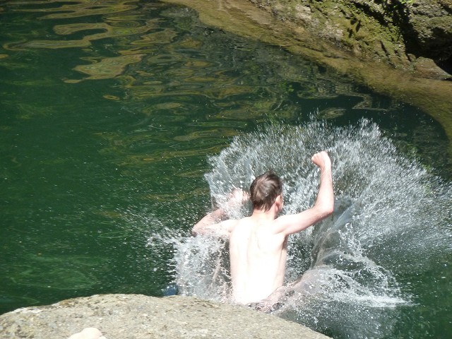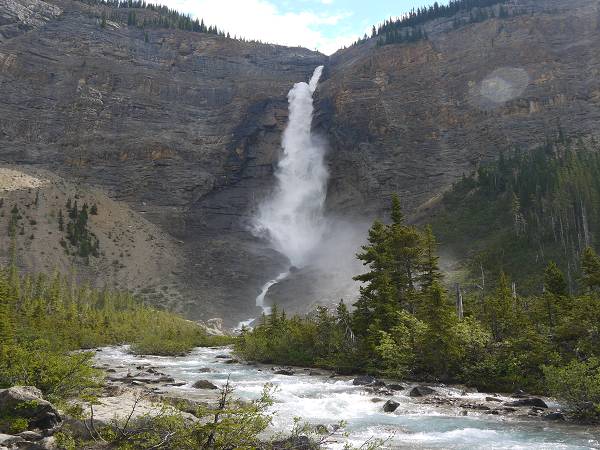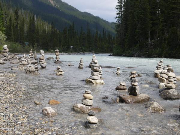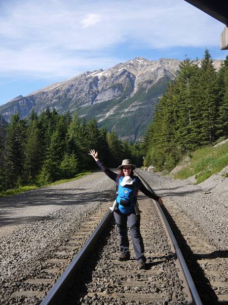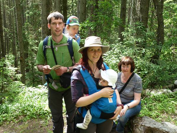 Als wir am Morgen erwachten war Anikas Auge endgültig zugeschwollen. Wir fuhren zum Arzt in Lake Louise, der jedoch geschlossen hatte, weil heute Sonntag war. In der Samson Mall ging Jana deshalb in ein Sportgeschäft und kaufte ein After Bite Gel. Als die Verkäuferin Anikas Auge sah rief sie sofort einen Arzt an, mit dem Jana dann telefonieren konnte. Dieser empfahl uns Antihistamin-Tabletten, die man gleich im Supermarkt nebenan kaufen konnte. Wir schmierten Anika das Gel aufs Auge und gaben ihr eine viertel Tablette, da es nur noch die Erwachsenenversion des Medikaments gegeben hatte. Anika war ganz tapfer. Hans und Sascha riefen währenddessen bei Fraserway an, da unsere Tür klapperte und eine Klappe am Wohnmobil sich nicht mehr schließen ließ. Die sollten wir einfach zutapen und WD40 auf die Tür sprühen. Na denn... Um 11 Uhr fuhren wir dann weiter zum Yoho Nationalpark und passierten dabei die Grenze von Alberta nach British Columbia. Wir checkten am Kicking Horse Campground ein. Obwohl wir keine Reservierung hatten, waren noch genügend Plätze frei. Die Stellplätze liegen sehr schön mitten in einem Wald. Nach dem Check-In fuhren wir jedoch noch ein Stück weiter zur Natural Bridge. Dies ist ein kleiner Felsbogen mitten im Fluss, der im Laufe der Zeit ausgehöhlt wurde. Anika bekam noch eine viertel Tablette und weinte diesmal beim Gel auftragen. Wir beschlossen einen ruhigen Tag zu machen und kehrten zurück zum Campingplatz. Wir aßen Eis, saßen im Schatten der Bäume und kochten Nudeln. Am Nachmittag wanderten wir auf dem Walk in the Past zu einer verlassenen Eisenbahn mitten im Wald. Der Weg führte auch über die Gleise der heutigen Bahnlinie und wir hatten Glück einen nicht enden wollenden Güterzug zu sehen. Wir standen also staunend am Rande und zählten die vielen Güterwaggons. Zurück auf dem Campingplatz gab es ein Lagerfeuer und Anika röstete Brot mit Opa Hans. Wir hatten jedoch alle nicht viel Hunger und so gab es nur ein kleines Obst-Abendbrot. Antonia konnte nicht einschlafen und Jana musste noch eine ganze Weile bei ihr bleiben.