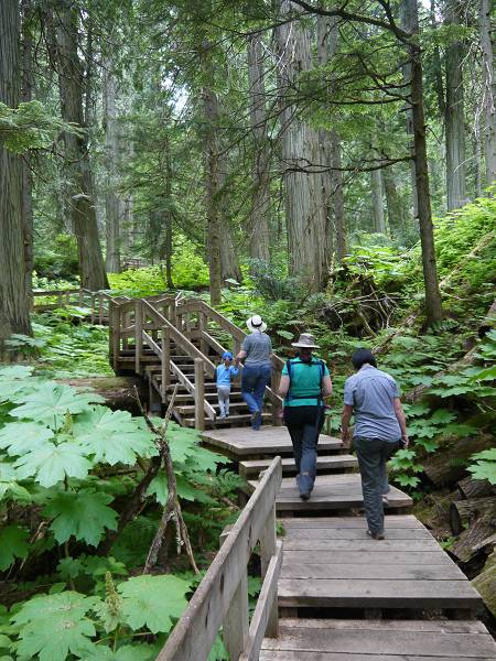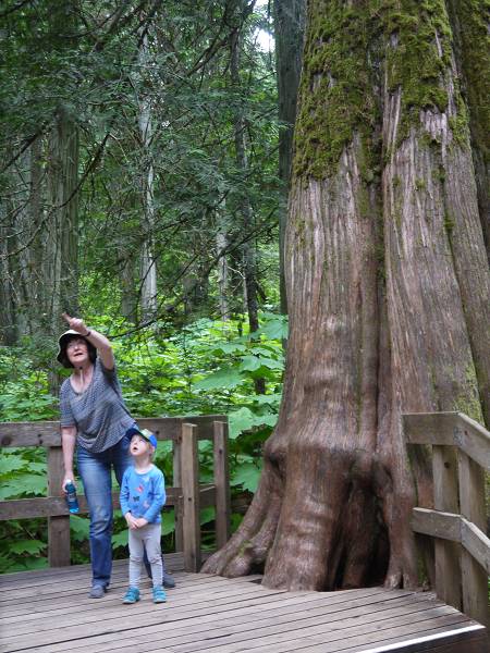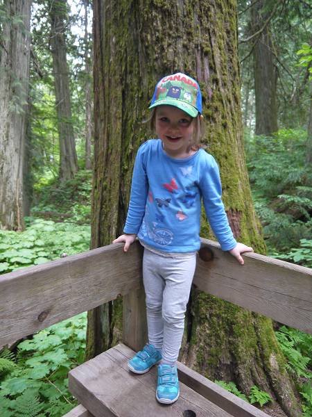 Heute schliefen wir bis 7:30 Uhr. Anika ging es etwas besser. Sie war zwar noch etwas anhänglich, aber immerhin ging die Schwellung am Auge zurück. Wir frühstücken draußen und nachdem wir unseren Abwasch erledigt hatten, fuhren wir die enge Passstraße hinauf zu den Takkakaw Falls. Die zweithöchsten Wasserfälle Kanadas sind echt beeindruckend! Jana, Sascha, Margit und Hans machten einen kleinen Spaziergang zum Fuße des Wasserfalls. Anika baute derweil mit Oma Angelika Steintürmchen am Fluss und war glücklich. Danach fuhren wir weiter bis Golden, wo wir eine kleine Kaffeepause bei Tim Hortons machten. Unsere Fahrt führte dann ohne Stopp durch den Glacier National Park, der wohl schon bessere Zeiten gesehen hat. Hier sah alles etwas heruntergekommen aus. Besser gefiel uns da der Revelstoke National Park wo wir am Giant Cedars Boardwalk anhielten und einen kleinen Spaziergang zwischen den riesigen Zedernbäumen machten. Anika lief fleißig die ganze Runde und Antonia schlief bei Mama in der Trage. Schließlich kamen wir am Revelstoke Campground an, der wirklich sehr schön ist. Der Pool war leider noch ohne Wasser, aber es gab WLAN und eine Laundry. Hier konnten wir endlich Wäsche waschen, was wir auch sogleich taten. Anika fütterte derweil die Kaninchen, die neben dem kleinen Spielplatz in einem Käfig hoppelten. Am Abend fuhren wir nach Revelstoke Downtown, wo wir zur Post gingen und durch die kleine Fußgängerzone spazierten. Im Hong Kong Restaurant machten wir Abendbrot. Antonia liebte die Asia-Nudeln von Oma und Anika futterte Reis mit Hühnchen von Mama. Da Antonia schon sehr müde war, fuhren wir zurück zum Campingplatz. Um 21 Uhr waren die Kinder im Bett und der Rest saß noch draußen bei Bier, Cider und Wein. Leider gab es viele Mücken, daher gingen wir um 22:30 Uhr schlafen.