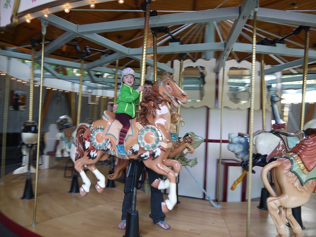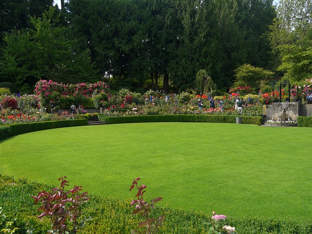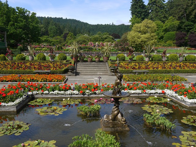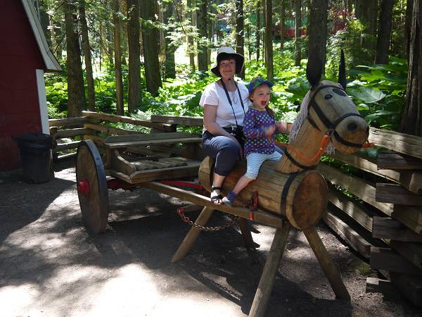 6:30 Uhr standen wir auf und auch heute gab es Frühstück wieder draußen. Kurz vor 9 Uhr fuhren wir ab in Richtung Butchart Gardens. Im Sunken Garden bestaunten wir die tollen Blumen. Dieser Teil war früher einmal ein Steinbruch gewesen - kaum zu glauben! Danach fuhr Anika mit dem Rose Carousel auf einem Pferd und einem Orca. Der Rosengarten gefiel Angelika besonders gut. Danach kam noch der Japanische Garten und der Italienische Garten. Kurz vor dem Ausgang gönnten wir uns noch eine Suppe und statteten dem Souvenirshop mit seinen zahlreichen Blumensamen einen Besuch ab. In den Gärten hätte man noch deutlich mehr Zeit verbringen können. Aber wir mussten heute noch zurück aufs Festland. 11:40 Uhr waren wir zurück am Camper und fuhren die letzten Kilometer bis zur Swartz Bay, von wo die Fähre nach Tsawwassen ablegte. Antonia rackerte während der Überfahrt auf dem Boden eines Aufenthaltsraumes. Zurück auf dem Festland fuhren wir zum Peace Arch Campground. Dort mussten wir heute leider noch Sachen packen. Zum Abendbrot brutzelten Hans und Margit Bratkartoffeln und Spiegeleier. Dann wollte Anika unbedingt in den Pool. Eigentlich wollten wir ja keine nassen Sachen mehr, aber schließlich gaben wir doch nach.