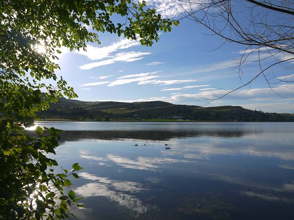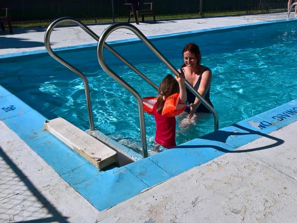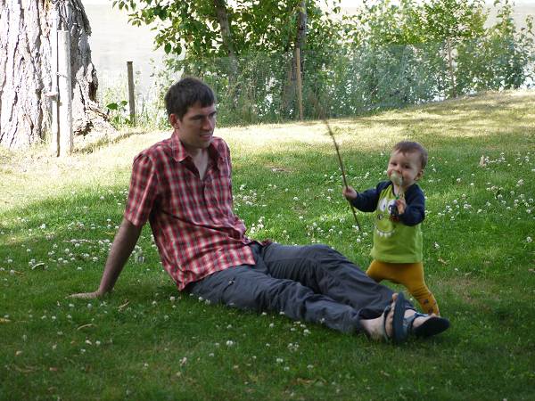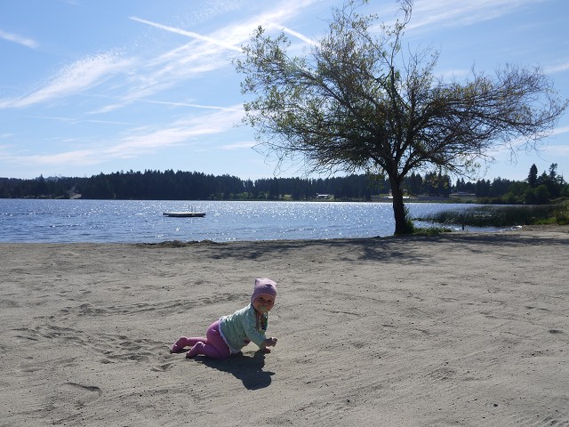 Zwischen 7 und 7:30 Uhr standen wir auf und frühstückten. Dann kauften wir Kirschen bei einer Nachbarfarm und starteten gegen 10 Uhr Richtung Penticton, wo wir gegen 11 Uhr ankamen. In einem T-Shirt-Laden auf der Main Street bekam Anika ein Ogopogo T-Shirt und war ganz glücklich darüber. Ogopogo ist quasi "Nessi" vom Okanagan Lake. Antonia dauerte unsere Suche nach einem Restaurant zu lang - sie hatte Hunger! Deshalb fütterten wir ihr Mittagsgläschen direkt auf der Straße und verloren prompt den Bügel von unserem Buggy. Im Restaurant "The Hooded Merganser" direkt am See aßen wir super leckeres Butter Chicken und Thai Chicken. Danach ging es weiter nach Osoyoos. Am Ortseingang wurde Antonia wach und schäkerte an einer Ampel mit Papa. Der passte einen Moment nicht auf und fuhr auf das vor ihm fahrende Fahrzeug auf. Glücklicherweise war nichts schlimmeres passiert. Dennoch musste Sascha fürs Protokoll zur Polizei und wir anderen warteten am Supermarkt daneben auf ihn. Danach fuhren wir zum Nk'mip Campground, wo wir ein wenig kämpfen mussten um zwei Plätze nebeneinander zu bekommen. Die vier Jungs im Büro des Campingplatzes sahen aus wie Taliban. Die Duschen gingen nur mit Dollar Coins, das waren wir von den bisherigen Plätzen nicht gewöhnt. Aber immerhin gab es am Eingang zum Campingplatz Pferde, die Anika nun auch unbedingt anschauen wollte. Und der See war toll zum Baden! Den Nichtschwimmerbereich trennten eine ganze Reihe Badeinseln vom Rest des Sees ab. Darauf hatten wir großen Spaß und selbst Antonia liebte das kühle Nass. 20 Uhr machten wir Abendbrot und Antonia ging direkt ins Bett, aber Anika wollte unbedingt noch einmal baden. Also gingen wir um 21 Uhr noch mal in den See zu einer Badeinsel. Dort saßen wir eine ganze Weile und schossen mit Wasserkanonen nach dem Mond. Es war inzwischen schon dunkel und die Lichter des gegenüberliegenden Ortes spiegelten sich im See. Und es waren immer noch unglaubliche 29 Grad! Nach dem Baden fiel nun auch Anika müde ins Bett. Der Rest blieb noch bis 23:30 Uhr draußen sitzen, bei immer noch 25 Grad...
