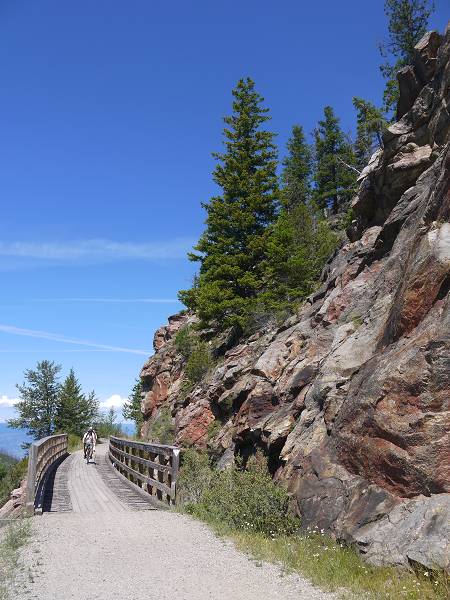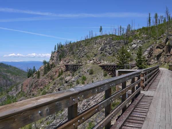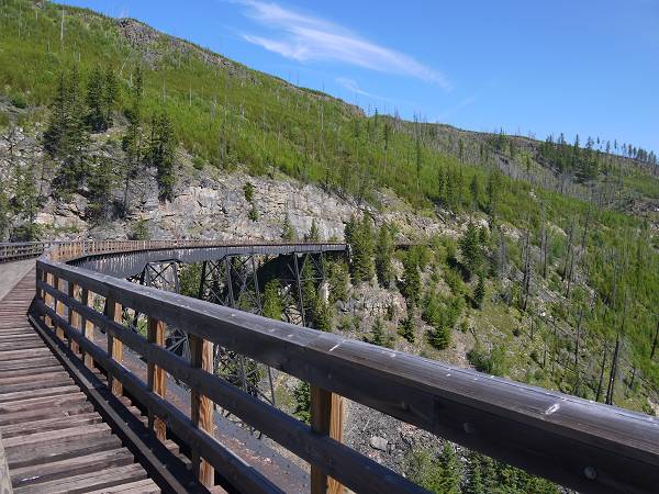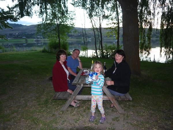 6:30 Uhr standen wir auf und auch heute konnten wir draußen frühstücken. Der Abwasch musste heute jedoch warten. Wir verstauten alles notdürftig und fuhren direkt los zum Myra Canyon. 9:30 Uhr sollten wir dort unsere Fahrräder in Empfang nehmen. Die Fahrt dorthin war allerdings abenteuerlich, denn es erwarteten uns 8 km Schotterpiste. Schließlich standen wir aber zur Abfahrt bereit mit unseren Fahrrädern und einem Doppelanhänger für die Kinder. Für beide Kinder war es die erste Fahrt im Fahrradanhänger. Anika kümmerte sich lieb um Antonia und wir fuhren über 19 Brücken und durch 2 Tunnel fast 7 km auf der alten Eisenbahnstrecke. Die Holzbrücken überspannen majestätisch die tiefen Abgründe. Irgendwann fing Antonia jedoch an zu weinen. Sie kam in Janas Trage auf den Rücken. Nun rastete allerdings Anika aus, denn sie wollte nicht alleine im Anhänger bleiben und auch zu Mama. Sie flitzte schreiend hinter Mama her. Schließlich versuchten wir es doch noch einmal beide Kinder in den Anhänger zu setzen und kehrten um. 4 Kilometer vor dem Ziel brüllte Antonia jedoch immer mehr. An einer Schutzhütte fütterten wir sie mit einem Flaschendeckel, da wir den Löffel vergessen hatten. Anika war inzwischen auch müde geworden und legte sich bei der Weiterfahrt quer über Antonia, was die natürlich mit erneutem Brüllen quittierte. So kam Antonia schließlich doch in die Trage auf Mamas Rücken. Jana und Hans fuhren bis zum Parkplatz nun auch schneller vorneweg. Angelika, Margit, Sascha & die mittlerweile eingeschlafene Anika kamen langsam hinterher und machten noch ein paar Fotos vom Myra Canyon. Als schließlich alle zurück im Wohnmobil waren brüllte Antonia immer noch. Sascha wickelte sie und hier war der Übeltäter: Sie hatte großes Geschäft gemacht und keiner hatte es bemerkt. Armes Kind! Danach war Antonia wieder ruhig und die Laune wieder besser. Wir fuhren weiter zur Summerhill Pyramid Winery. Dort gab es tolles Essen in einem Biobistro. Wir aßen Pizza - die ausnahmsweise mal italienisch dünn war - und Nudeln. Außerdem genossen wir den fantastischen Ausblick auf den Okanagan Lake und die Weinberge. Danach fuhren wir zum Mission Creek Regional Park, wo wir den Nachmittag auf einem hübschen Spielplatz an einem Bach genossen und Eis futterten. Dann ging es zurück zum Campingplatz, wo wir wieder draußen Abendessen machten. Anika war müde und schlecht gelaunt. Antonia hingegen konnte nicht schlafen wegen Anikas Geheul. Erst 21:30 Uhr war Ruhe und Jana musst du die ganze Zeit bei Antonia bleiben. Die anderen saßen noch bis 23 Uhr draußen.
