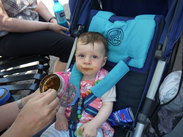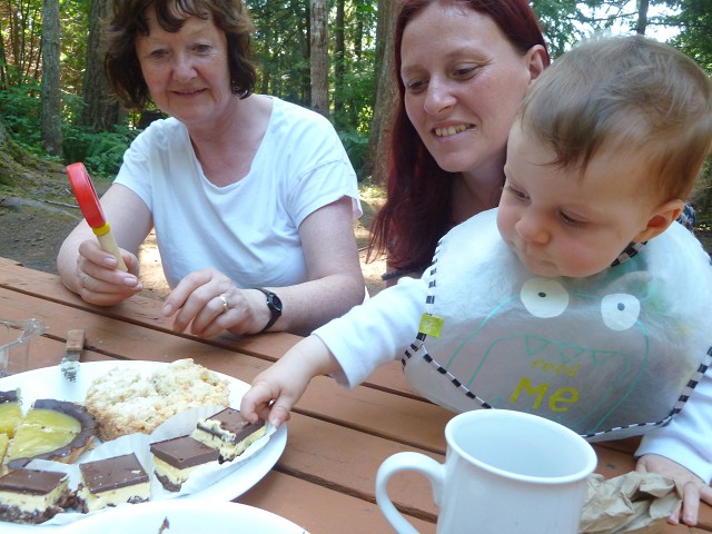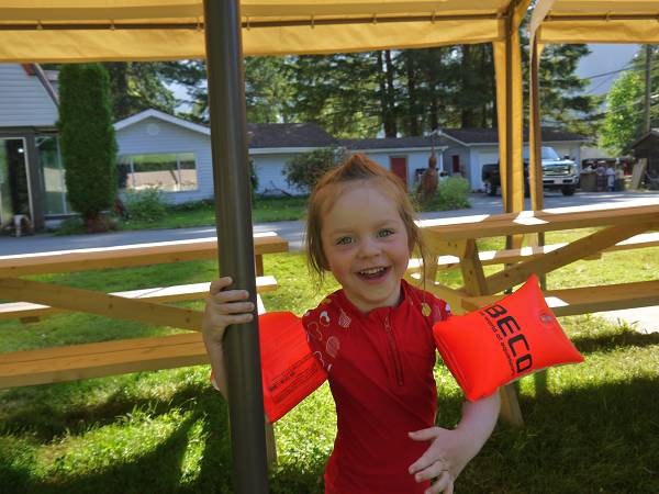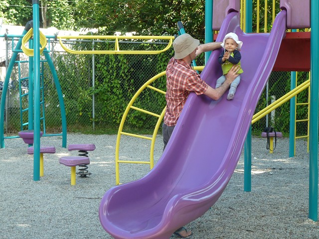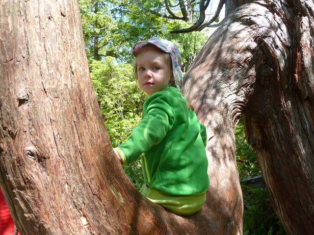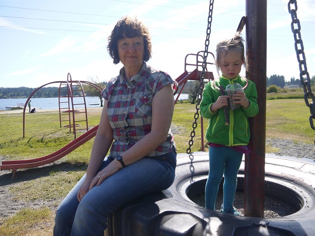 Antonia weckte uns um 7 Uhr und wir frühstücken wieder draußen. Dann brachen wir auf zum Brannen Lake. Hier spielte Antonia im Sand und Anika auf dem Spielplatz. Der See war erstaunlich warm, aber dennoch gingen wir nicht baden. Wir fuhren stattdessen weiter nach Parksville in den Community Park. Hier gab es einen tollen Wasserspielplatz. Allerdings war es sehr windig und dadurch auch etwas kalt. An einer Imbissbude mussten wir ewig warten aufs Mittagessen, was dann auch noch ziemlich geschmacksneutral war. Antonia hatte es besser mit ihrem Brei. Am Strand herschte gerade Ebbe und man konnte die schneebedeckten Berggipfel des Festlandes sehen. Wir tankten und fuhren dann weiter zum Top Bridge Park. Jana und Sascha konnten der Versuchung nicht widerstehen und badeten im Fluss und die Omas immerhin mit den Füßen. Dann fuhren wir weiter zu den Englishman River Falls. Ein Rundweg führte zu den Upper Falls und dann weiter zu den Lower Falls. Erstere sind deutlich spektakulärer und fallen wie die Victoria Falls in Afrika in einen Canyon. Auch Anika wanderte den gesamten Weg, ohne getragen werden zu müssen. In den Lower Falls badeten wieder Leute im Fluss, aber hier war es nicht so schön und auch etwas schattig. Daher fuhren wir weiter zum Coombs Country Market und es gab erstmal ein großes Eis für alle. Danach entdeckten wir auch die Ziegen auf dem Dach - die lokale Attraktion. Außerdem hoppelten ganz viele Häschen über das Gelände. Einige Kilometer weiter erreichten wir dann auch unser Ziel für heute: den Coombs Country Campground. Dieser liegt hübsch im Wald und bietet einen Spielplatz mit Flying Fox sowie einen großen Pool. Ein Mann lies ein ferngesteuertes Auto mitten durch den Wald flitzen und Anika war schwer begeistert. Antonia hingegen hatte früh rote Bäckchen und schlief unruhig ein. So legte sich Jana ab 22 Uhr zu ihr, der Rest blieb noch länger draußen.