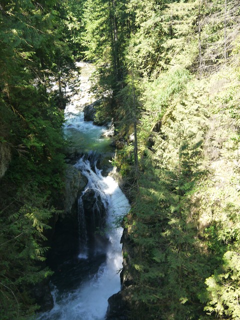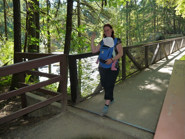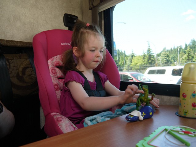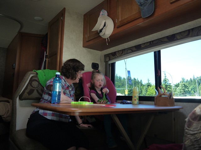Um 7 Uhr standen wir auf und Anika schrie, denn sie wollte nicht aufstehen. Wir frühstückten draußen, was aber bei nur 13 Grad etwas gewagt war. Etwa 9:30 Uhr brachen wir schließlich auf in Richtung Vancouver. Jana stieg kurz vor Vancouver mit in das vorausfahrende Wohnmobil von Margit & Hans und lenkte alle durch die Großstadt. Als wir die Toll Bridge umfahren wollten, verfuhren wir uns ein bissl, kamen aber schlussendlich gut am Lynn Canyon an. Hier war es rappelvoll und wir fanden nur mit Mühe einen Parkplatz. Dennoch machten wir eine kleine Wanderung über die Swing Bridge zur Twin Falls Bridge. Im Lynn Canyon Café holten wir uns Kaffee, Eis und Obstsalat zum Mitnehmen und machten es uns draußen auf einer Bank gemütlich. Antonia spielte im Dreck und zwei Chinesinnen wollten sie unbedingt fotografieren, was wir aber abwehrten. Im Ecolodgy Center kauften wir einige Spielzeug-Dinos und Nordamerika-Tiere. Danach ging es zu unserem Campingplatz, dem Capilano River RV Park, wo wir gegen 15 Uhr ankamen. Die Kinder freuten sich über den Spielplatz und 17 Uhr sprangen wir auch noch alle in den Pool. Danach war Antonia müde und hatte Hunger. Also bekam sie ihren Brei. Für alle anderen hatte Oma Angelika in der Zwischenzeit Nudeln gekocht. Antonia wollte nun auch noch mal Nudeln! Danach ging sie ins Bett und Anika noch mal auf den Spielplatz. Um 20:30 Uhr wachte Antonia noch einmal auf und konnte danach nicht mehr einschlafen. Erst um 22 Uhr schlief sie mit einem Milchfläschchen wieder ein. Wir saßen dennoch eine ganze Weile draußen.