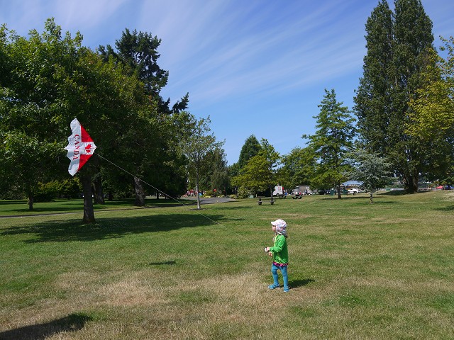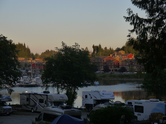 Die Nacht war kalt gewesen! Wir standen um 7 Uhr auf und Frühstück machten wir trotzdem draußen, obwohl uns allen etwas kalt war. Schließlich fuhren wir wieder auf die Ostseite der Insel. Am Sproat Lake schauten wir uns die Waterbomber an, die riesigen Wasserlöschflugzeuge, die hier stationiert sind und zum Einsatz kommen wenn es in der Nähe Waldbrände gibt. Da wir Qualicum Beach so hübsch gefunden hatte, wollten wir heute zum Mittag noch einmal hierher kommen. Das kleine französische Café hatte am Wochenende leider geschlossen. Wir fanden eine kleine Coffee Bar, wo wir Thai-Suppe bzw. Bratkartoffeln mit Spiegeleiern aßen. Sehr lecker! Weiter ging es dann nach Chemainus, wo gerade ein Bluesfest stattfand. Der ganze Ort war ein einziger Flohmarkt. Wir bewunderten die berühmten Wandbilder im Ort und bummelten durch die netten Lädchen und den Christmas Shop. Anikas Favorit war eindeutig die Eisdiele. Um 17:30 Uhr kamen wir in Duncan an. Da es schon spät war, machten wir nur einen kurzen Stopp am alten Bahnhof, wo wir die alte Lok und die Totempfähle anschauten. In einem Indianer-Shop kauften wir einen Gummi-Orca für Anika, bevor wir die letzten 50 km bis zum Victoria Campground zurücklegten. Schnell kochten wir Reis mit Butter Chicken zum späten Abendbrot. Antonia schlief trotzdem erst um 22 Uhr ein und auch wir anderen waren für heute platt.