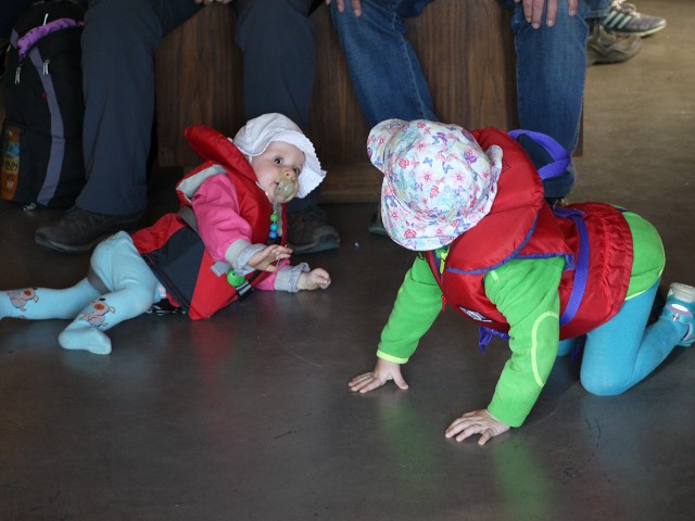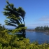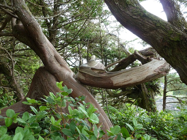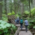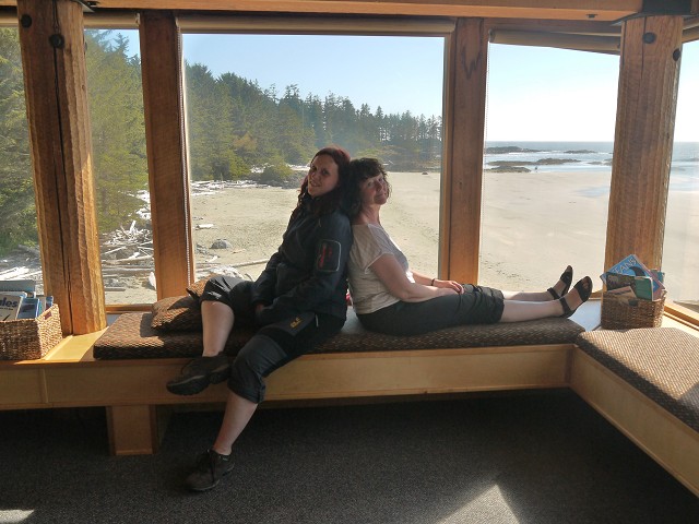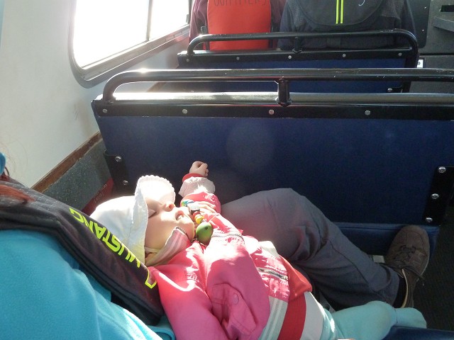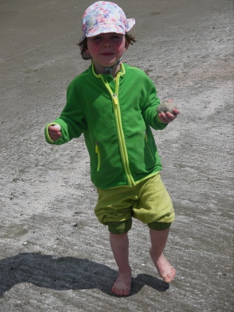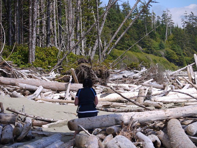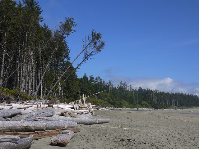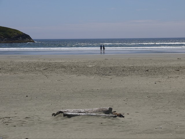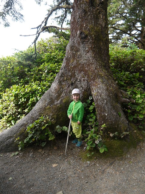 Um 7 Uhr standen wir auf zum Duschen. Wir frühstückten wieder draußen und beim Abräumen passierte es: Jana fiel hin und brauchte 4 Pflaster am Knie. Ausgerechnet heute, wo wir eine größere Wanderung auf dem Wild Pacific Trail machen wollten. Weil Janas Knie schmerzte, nahm heute Opa Antonia in die Trage, wo sie gemütlich die meiste Zeit der Wanderung schlummerte. Für Anika war der Weg über Stock und Stein so spannend, dass sie nicht getragen werden wollte. Mittag machten wir dann im Supermarkt Co-op, wo wir uns an einer heißen Theke mit Calzone und Suppe und an der Salatbar eindeckten. Zum Nachtisch gab es außerdem Obstsalat. Danach wollten wir uns noch die berühmten Strände der Westküste anschauen. Der erste war Long Beach. Das Wasser des Pazifik war sehr kalt, aber zumindest mit den Füßen trauten wir uns hinein. Wir beobachteten die Surfer und Anika spielte im Sand. Dann fuhren wir ein Stück weiter zum Combers Beach. Hier musste man erst 500 m durch den Wald laufen, um ans Wasser zu gelangen. Es lag viel Treibholz am Strand, dafür gab es hier eine Baumschaukel und die Sonne schien vom blauen Himmel. Am Wickaninnish Beach mit dem Kwisitis Visitor Center hingegen begann es zu regnen. Der Souvenirladen war schon zu und das Café wohl dauerhaft geschlossen. Aber die Ausstellung mit einem Kanu gefiel uns gut. Eigentlich wollten wir noch ein Schiffswrack am Big Beach anschauen, aber im Visitor Center sagte man uns, dass man das Wrack nicht mehr sehen kann. Deshalb fuhren wir nicht hin, sondern zurück nach Ucluelet, wo wir Jamies Gift Shop einen Besuch abstatteten. Wir kauften einen Sweater und ein T-Shirt für Anika, Magnete und zwei Thermosflaschen für die Kinder. Abendbrot machten wir wieder draußen. Anika tat sich heute schwer mit dem Einschlafen und so war Papa Sascha eine ganze Weile bei ihr.
