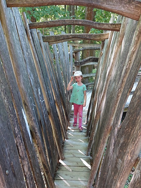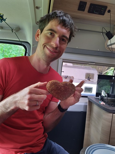 Wir schliefen wieder bis zur üblichen Zeit. Jana ging los, um die Brötchen abzuholen, die wir tags zuvor bestellt hatten. Sie brauchte überraschend lange, denn die Brötchenausgabe war schlecht organisiert. Die Kinder begannen schon wieder zu spielen, als wir noch ausgiebig frühstückten und schließlich aufräumten. Schließlich ging Sascha mit den Mädchen zum See und Jana kam kurz darauf frisch geduscht nach. Anschließend ließ Sascha mit den Mädchen gemeinsam an der Entsorgungsstation das Schmutzwasser ab und wir füllten neues Wasser auf bis der Wassertank überlief. Dann fuhren wir zur Rappbodetalsperre. Dort gab es erst einmal Pommes und Süßkartoffelpommes für alle und eine Waffel für Anika. Danach kauften wir unsere Tickets für die Titan RT-Hängebrücke. Wir spazierten über die 458,5 Meter lange wackelige Hängebrücke mit tollem Ausblick über die Talsperre. Danach ging es durch die pralle Sonne über die Staumauer zurück. Für Jana war es zu viel Hitze, sie verkrümelte sich in den Schatten. Sascha wartete mit den Kindern noch darauf, dass Leute den Mega-Swing oder die Zipline machten. Es dauerte eine ganze Weile, dann flogen sie über unsere Köpfe hinweg. Danach fuhren wir weiter mit einem kurzen Stopp am Blauen See, der leider fast völlig ausgetrocknet war. Also schnell weiter zur Uroma, die bereits mit leckeren Erdbeerkuchen auf uns wartete. Am Abend fuhren wir mit der Uroma zum Klosterfischer in Blankenburg und genossen leckeren Zander. Nur Anika kam aufgrund ihrer panischen Wespenangst nicht dazu, ihr Schnitzel zu essen. Dann flitzten die Kinder um die Fischteiche herum und die Erwachsenen konnten sich noch etwas unterhalten. Schließlich brachten wir die Uroma nach Hause und fuhren zum Campingplatz am Regenstein. Diesen hatten die Besitzer auf einem verwaisten Parkplatz errichtet, der vor 20 Jahren für ein Spaßbad gebaut worden war, dass dann nie fertiggestellt wurde. Die 2 Besitzer kamen eigentlich aus der Veranstaltungsbranche und waren aufgrund von Corona damit quasi arbeitslos. So hatten sie die Idee zum Pop-Up-Campingplatz. Wir fanden die Idee klasse und das Gelände bietet gutes Potential, um vielleicht in einigen Jahren auch zum richtigen Campingplatz zu werden. Sascha drehte mit den Mädchen noch mehrere Runden über den Platz, danach nahmen Jana und Anika noch eine erfrischende Dusche, in dem provisorischen Duschcontainer, der am Ende des Platzes stand. Gegen 22 Uhr war es dann Zeit zum Schlafen.