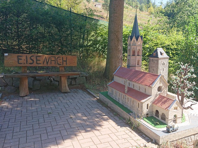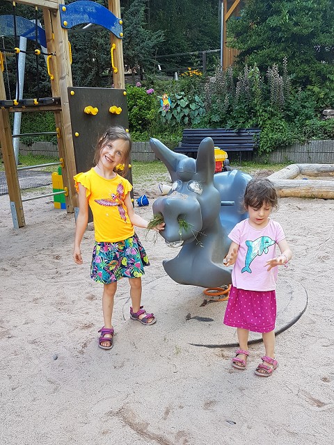 Kurz nach 8 Uhr stand Sascha auf und holte Brötchen, während Jana das Frühstück zubereitete. Wir hatten heute einen kleinen Gast beim Frühstück: eine Katze saß bettelnd vor dem Wohnmobil. Wir fütterten sie mit ein paar Gelbwurstscheiben. Die Kinder spielten anschließend noch kurz mit den Nachbarskindern und auf den Steinpferden, dann fuhren wir nach Ruhla. Hier trafen wir wieder auf Oma und Opa, mit denen wir die wahrscheinlich schnellste Sommerrodelbahn Deutschlands hinabsausten. Zuerst fuhren die Kinder jeweils einmal mit Oma und Opa, danach jeweils einmal mit Mama und Papa. Vor allem die Fahrten mit Sascha waren fast ungebremst. Dann besuchten wir das Mini-a-Thür, wo es etwa 100 Gebäude aus Thüringen im Maßstab 1:25 zu betrachten gibt. Zudem gab es einen Spielplatz samt Café, der für uns alle spannender war. Hier verbrachten wir die meiste Zeit. Erst kurz nach 17 Uhr verließen wir den Miniaturenpark und luden Anikas Sachen auf dem Parkplatz in das Auto von Oma und Opa, denn sie würde noch 2 weitere Wochen hier in Thüringen verbringen, bis sie im September in München in die Schule kommen würde. Zum Abschied fuhren wir aber noch einmal alle gemeinsam nach Eisenach, um im Biergarten beim Restaurant Storchenturm ein sehr gutes Abendbrot zu genießen. Dann verabschiedeten wir uns von unserer großen Tochter und von Margit und Hans. Wir fuhren zu dritt zum Altenberger See zurück und Antonia spielte am Abend noch bei den Steinpferden, während Jana Sachen zusammenpackte. Dann war es dunkel und spät genug, um ins Bett zu gehen.